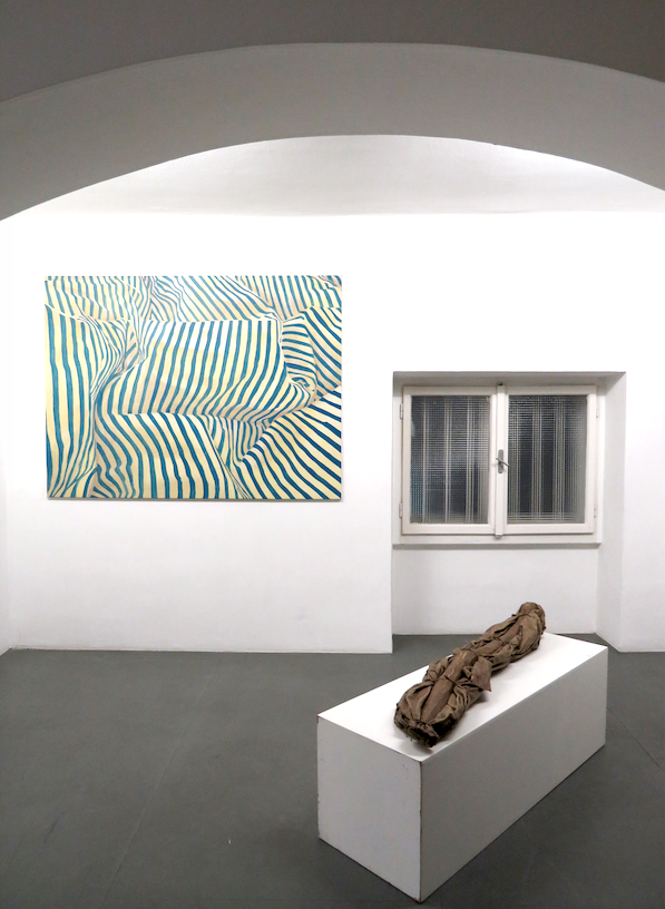 Artworks by Fabian Erik Patzak (left), from the cycle "Staying Undercover", 2023, oil on canvas, 100 x 140 cm / Marian Palla (right), Wrapped, object from the early 80´s, wood, textile, cord and clay, 120 x 23 ø cm © Carol Tachdjian