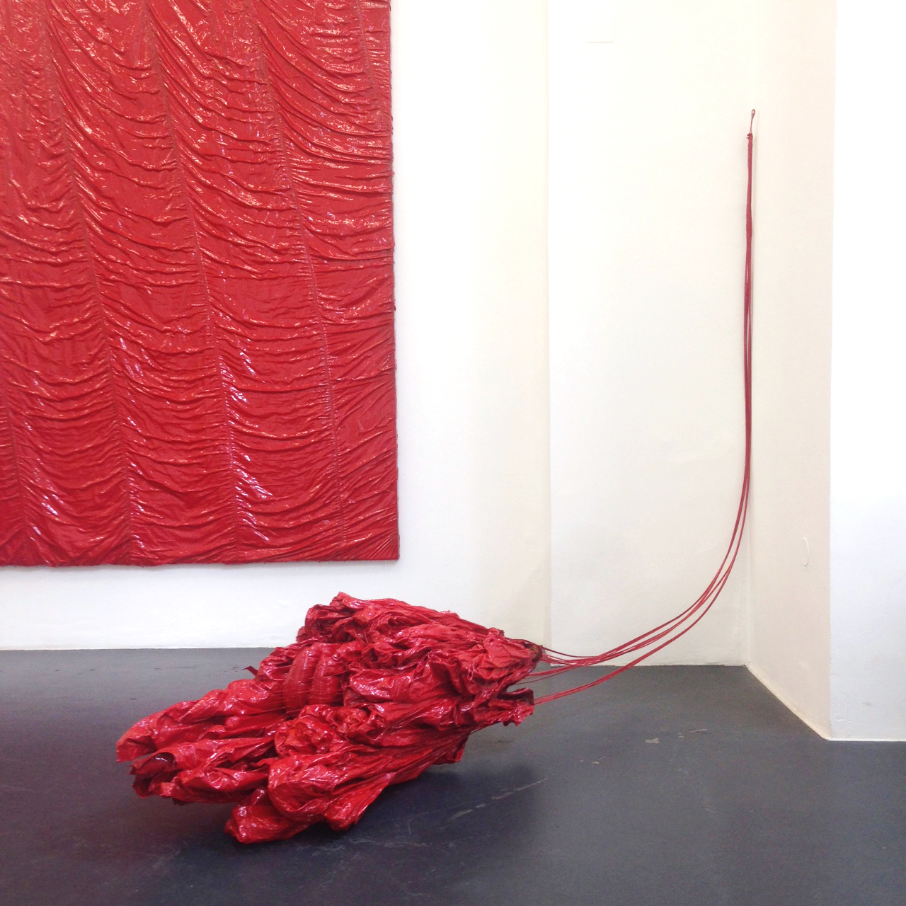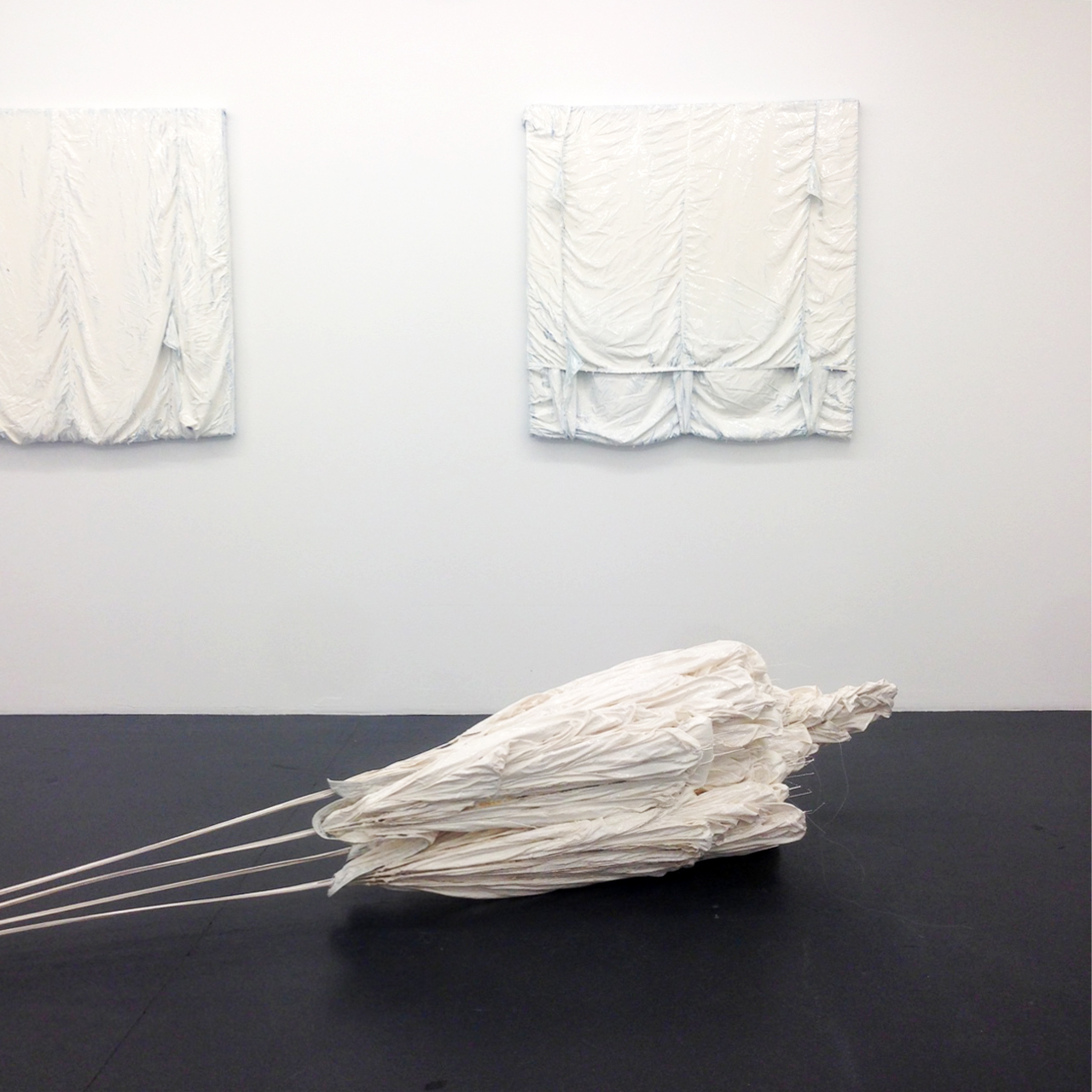 Exhibiiton view "Grounded" by Clemens Wolf _ PARACHUTE SCULPTURE #5, 2016, 490 X 60 cm, Resin on reserve parachute