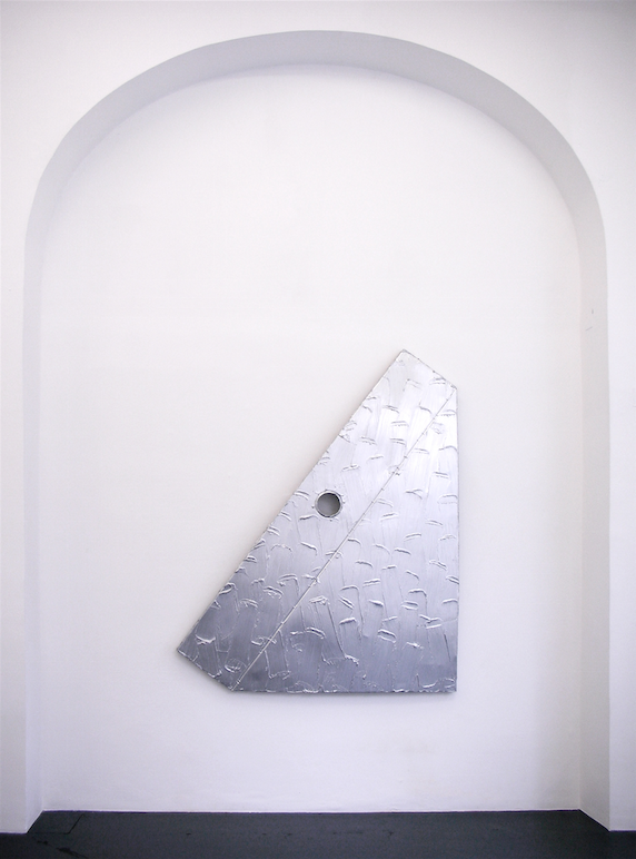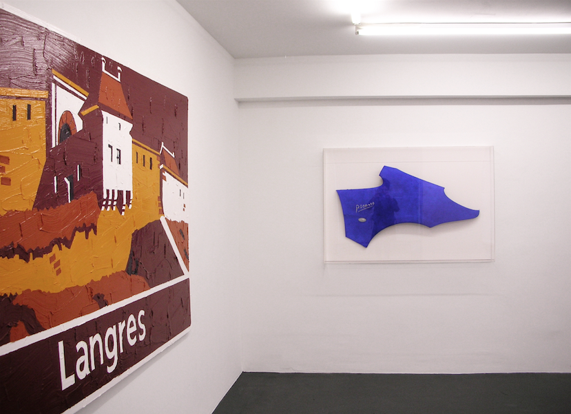 de gauche à droite : „Langres“, 2012, Peinture acrylique sur panneau autoroutier, 160 x 240 cm / „Picasso Outremer“, 2008, Peinture acrylique sur aile d'automobile dans une boite en plexiglas, 91 x 135 x 16 cm