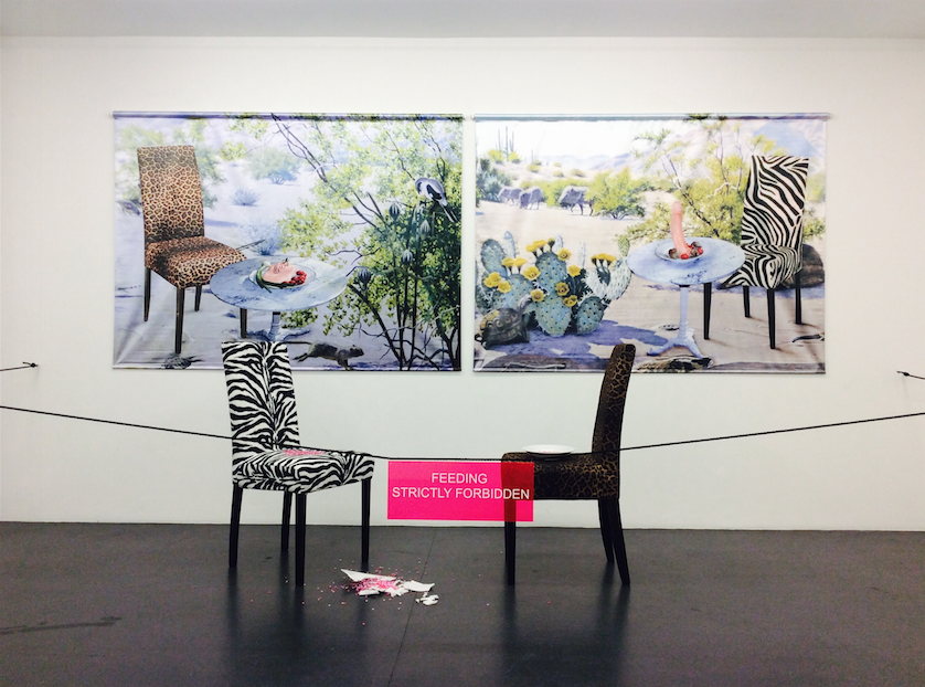 Zebra und Leopard, 2007, 2x Digiprint auf Satin, 2 Sessel, schwarze Kordel, Plexiglasschild mit Klebebuchstaben, Glasperlen, 2 Porzellanteller, 200 x 400 m