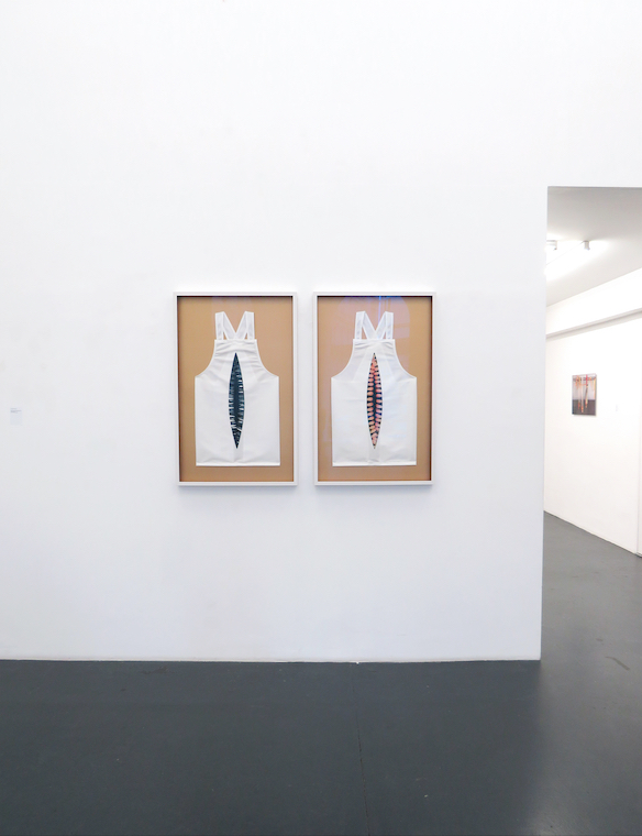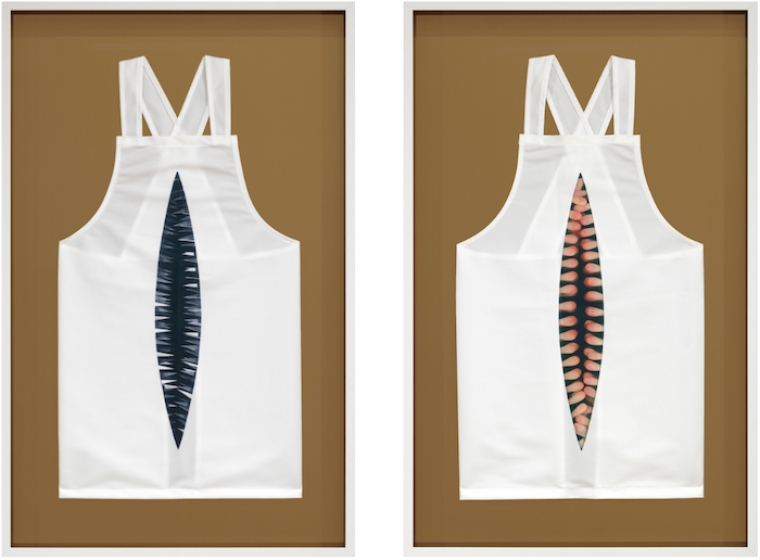 In der Ausstellung "Intimacy", werden zwei besondere Werke "Vagina dentata“ und "Vagina tenera“, 2022 entstanden, zum ersten Mal gezeigt. Es handelt sich dabei um gerahmte Küchen- oder Arbeitsschürzen. Auf die Schutzkleidungstücke sind zwei verschiedene Motive bedruckt : scharfe Skalpellklinge auf „Vagina dentata“ und sanfte Wölbungen der Streicheleinheiten auf „Vagina tenera“. Die Form des Motivumrisses erinnert an eine Öffnung und bittet uns eine frontale Sicht ins Innere - und dies ist nicht ohne Witz da die Schürze doch den Köper ummantelt und schützen sollte.