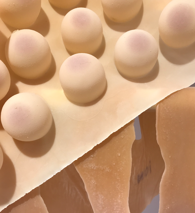 Renate Bertlmann entwickelt sehr schnell ihr eigenes Verfahren, um Latexmembranen und Schnullerzusammensetzungen zu erstellen. Diese Latexhäute, auch "Streicheleinheiten" genannt, werden zum Mittelpunkt des Kunstkomplexes „Ironie“, Teil der Trilogie „AMO ERGO SUM“.