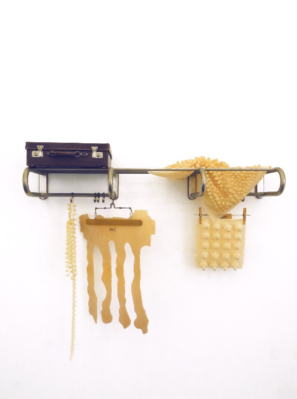 Renate Bertlmann, Garderobe, 2023, Streicheleinheiten 1976-2923, Latex, Vintage wardrobe, vintage suitcase